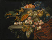 Nature morte aux cédrats et campanules mauves avec un vase de fleurs