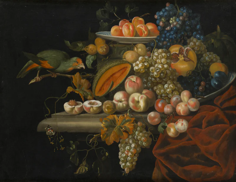 Perruche et plats de fruits sur un entablement