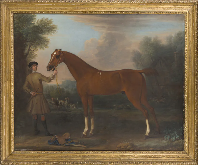 Cheval de chasse à la robe alezane, tenu par un palefrenier