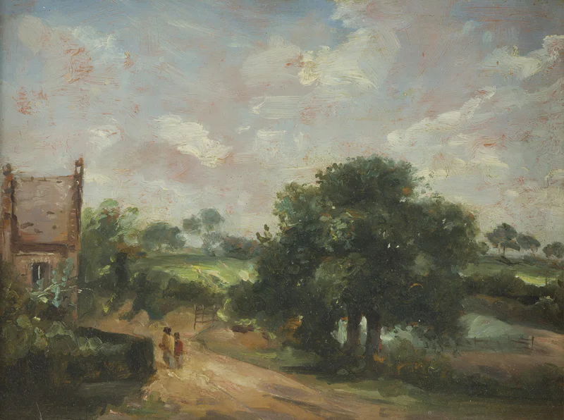 Paysage avec des promeneurs sur un chemin près d'une mare