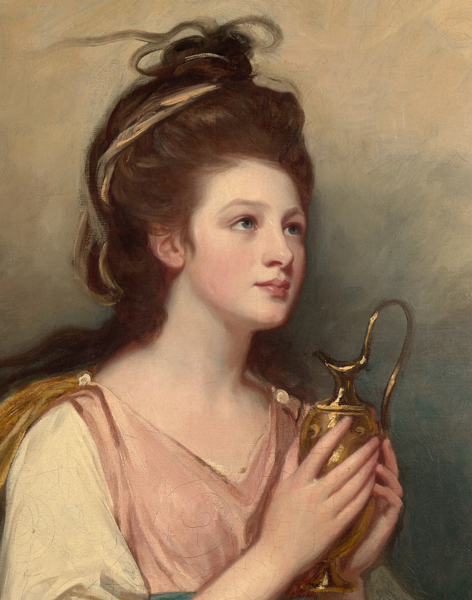 Dans notre portrait historié, Miss Vernon est représentée en Hébé. Fille de Zeus et Héra, cette déesse de la jeunesse était l’échanson des dieux et nourrissait son père, sous la forme d'un aigle, avec un calice ou d'un autre récipient, qui est son attribut iconographique. La jeune femme laisse paraître une expression douce et délicate, regardant légèrement vers le haut, évoquant un sentiment de contemplation sereine.