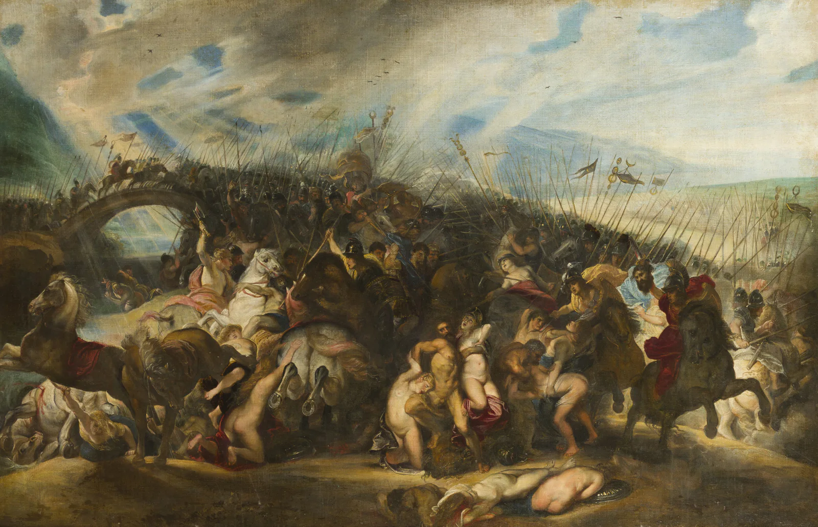 Nommé en 1603 peintre de la cour par l’important mécène et collectionneur Vincent de Gonzague, Rubens réalise alors ses premiers grands chefs d’œuvre intégrant toute sa culture gréco- romaine dépassant les compositions de la Renaissance et du Maniérisme. Le peintre exprime une fluidité de mouvement ainsi qu’un enchaînement tourbillonnant des groupes qui appartient pleinement au Baroque dont ce tableau est l’une des premières expressions. Au moment où la plupart des artistes hésitent entre le réalisme de Caravage et le Classicisme des Carrache, Rubens trouve déjà son style personnel qu’il va développer tout au long de sa carrière et qui influencera la peinture européenne pendant des siècles. Un sens luministe nouveau apparaît. La grande trouée des rayons de soleil dans les nuages blancs dans un bleu limpide est d’une liberté absolue, prélude à l’art d’un Velázquez (Les Lances, v. 1635, Musée du Prado) ou Delacroix (Les Massacres de Scio,1824, Musée du Louvre).